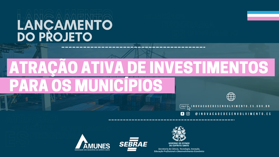 O Governo do Estado, por meio da Secretaria de Inovação e Desenvolvimento (Sectides) lança, na próxima terça-feira (23), o Projeto Atração Ativa de Investimentos para os municípios. O evento de lançamento vai ocorrer às 10 horas, no auditório do Serviço Brasileiro de Apoio às Micro e Pequenas Empresas (Sebrae), em Vitória, e é voltado para gestores municipais de todas as regiões do Estado.